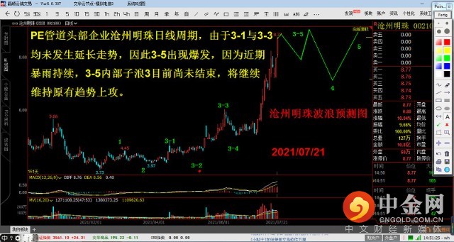 沧州明珠波浪预测图。PE管道头部企业沧州明珠日线周期,由于3-1与3-3均未发生延长走势,因此3-5出现爆发,因为近期暴雨持续,3-5内部子浪3目前尚未结束,将继续维持原有趋势上攻。