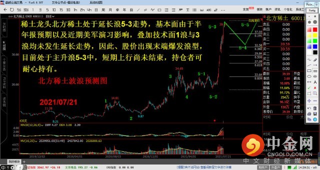 北方稀土波浪预测图。稀土龙头北方稀土处于延长浪5-3走势,基本面由于半年报预期以及近期美军演习影响,叠加技术面1浪与3浪均未发生延长走势,因此股价出现末端爆发浪型,目前处于主升浪5-3中,短期上行尚未结束,持仓者可耐心持有。