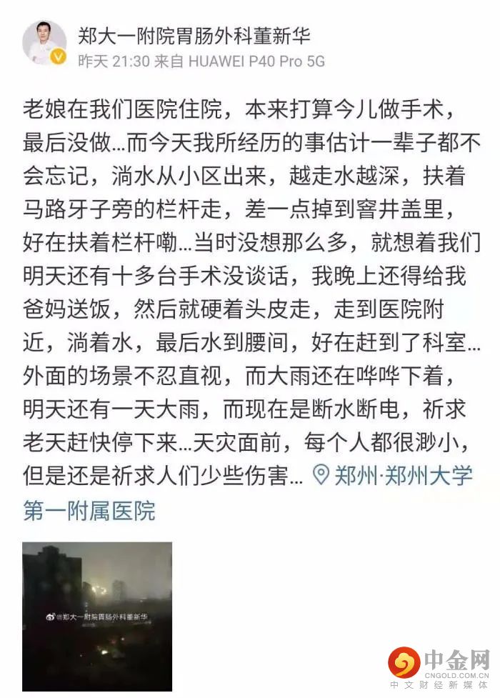 据微博认证为“郑大一附院胃肠外科董新华”的医生也公开发布了当时的情况。董新华称他的母亲在该医院住院,原本7月20日要做手术,但最后没有做成,一些教授也被困门诊。