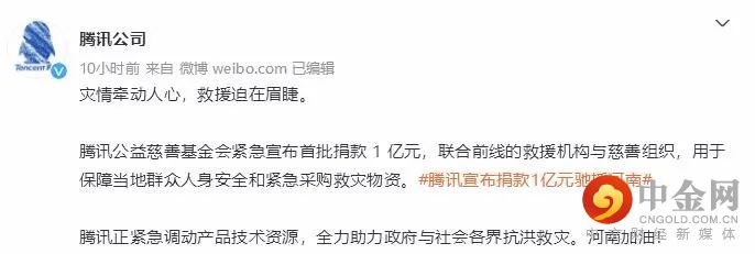 7月21日凌晨,腾讯集团宣布,腾讯公益慈善基金会将首批捐款1亿元,联合前线的救援机构与慈善组织,用于保障当地群众人身安全和紧急采购救灾物资。
