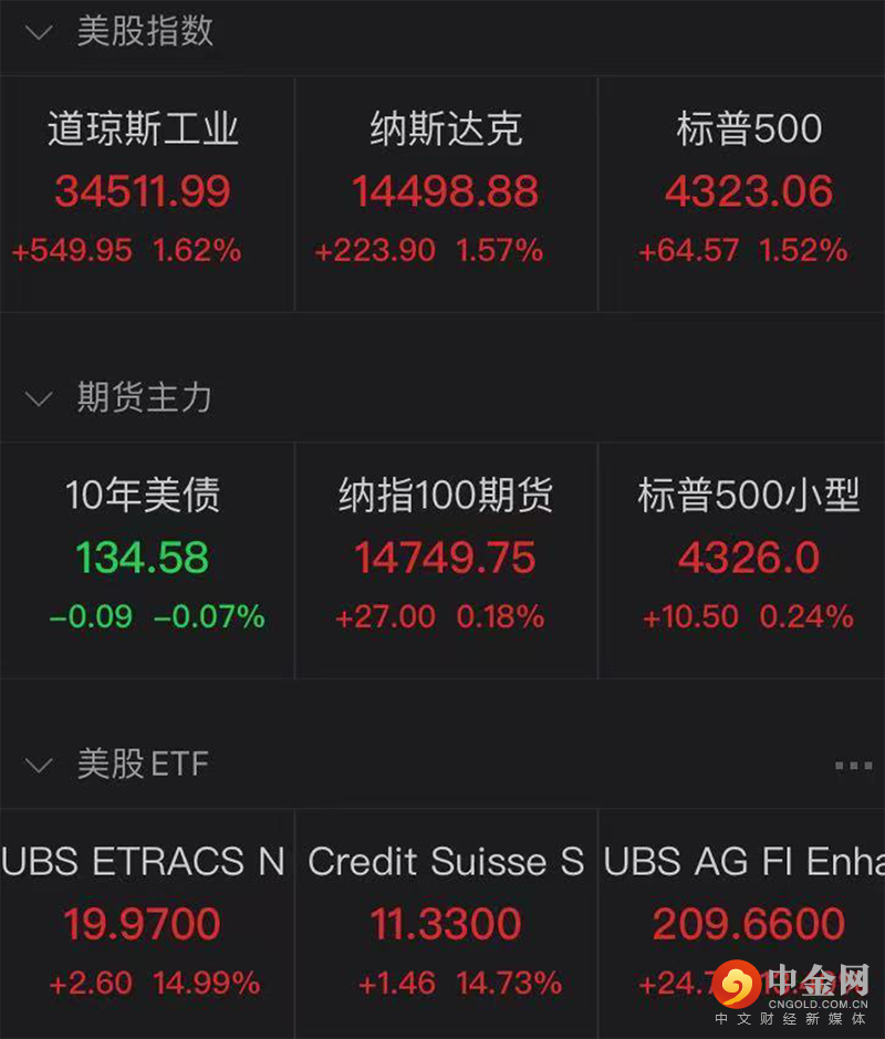 美国三大股指周二高开高走,道指盘中涨近660点,收盘上涨549.95点,涨幅为1.62%,创6月21日以来最大收盘涨幅。标普500指数收涨1.52%至4323.06点,创3月26日以来最大收盘涨幅。纳指收涨1.57%,报14498.88点,创5月20日以来最大收盘涨幅。