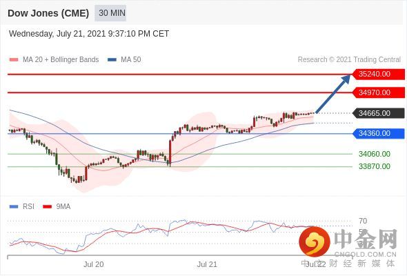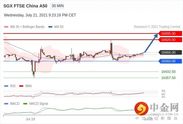 RSI技术指标超过50。MACD技术指标处在其信号线之上 看多。此外,价位高于其20个时期及50个时期移动平均线 ( 分别位于 16635.35 和 16639.60 )。