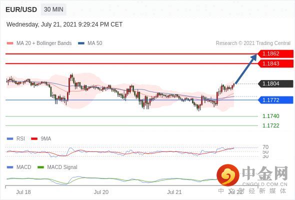 RSI技术指标超过50。MACD技术指标呈现看多状态并 处在其信号线的上方。此外,价位处在其20天及50天移动平均线上方 ( 当前是 1.1785 和 1.1779 )。