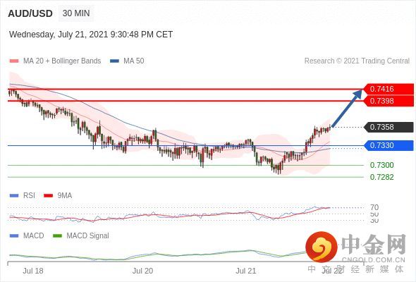 RSI技术指标超过50。MACD技术指标处在其信号线之上 看多。此外,价位高于其20天及50天移动平均线 ( 分别位于 0.7336 和 0.7326 )。
