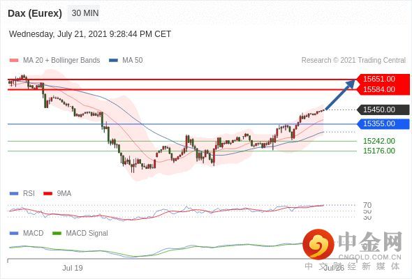 RSI技术指标在70之上,则可以认为有持续向上的趋势,或者处在一种超买的状态下,需要进行技术上的调整。我们可以通过比较RSI技术指标和价位之间的变化趋势,来观察是否在两者间存在技术背离现象。MACD技术指标呈现看多状态并 处在其信号线的上方。此外,价位高于其20个时期及50个时期移动平均线 ( 分别位于 15385.10 和 15303.04 )。