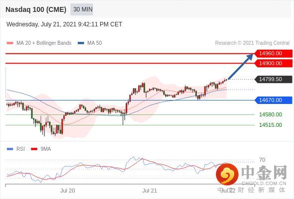 在 14670.00 之上,看涨,