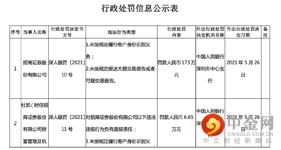 6月4日,中国人民银行深圳市中心支行公布了3张罚单,涉及招商证券及相关责任人。罚单显示,该公司存在未按规定履行客户身份识别义务,未按规定报送大额交易报告或者可疑交易报告两项违法违规行为,中国人民银行深圳市中心支行对其处以罚款173万元,相关责任人遭不同程度处罚。