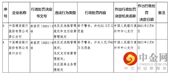 2月20日,中国人民银行福州中心支行官网公布的行政处罚信息显示,建设银行两家分行均因违反反洗钱管理规定等违法违规行为,收到央行罚单,合计被罚104.5万元,7名相关责任人分别被罚款。