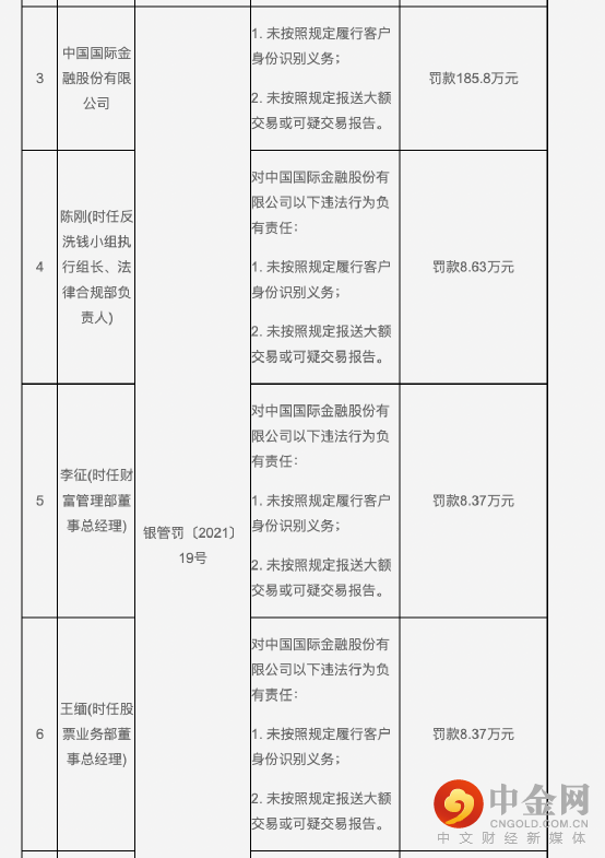 此外,中金公司时任相关业务负责人也同样遭到处罚,包括时任反洗钱小组执行组长、法律合规部负责人陈刚,时任财富管理部董事总经理李征,时任股票业务部董事总经理王缅,时任信息技术部执行总经理张旻,分别被处以罚款8.63万元、8.37万元、8.37万元、8.63万元。