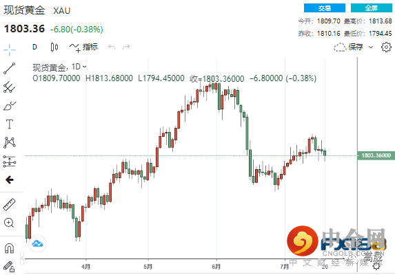 COMEX 8月黄金期货收跌0.4%,报1803.40美元/盎司,创最近约两周收盘新低。