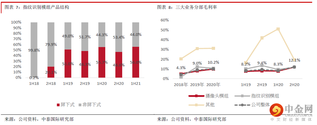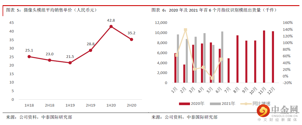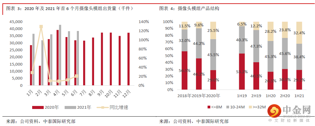 公司盈喜指出1H21净利润预期同比增长40-60%至4.7-5.4亿元,与我们预期相差不大。管理层表示1-4月份预期利润增长的最核心积极因素为毛利;此外,今年A股分拆上市带来的资产重组会产生一次性成本。今年前六个月32M像素及以上摄像头模组产品销售数量占比进一步提升至32.4%,略高于全年占比不低于30%的指引,8M像素及以下摄像头模组产品销售数量占比为29.2%,与去年全年相若,产品结构持续改善,反映光学升级趋势仍在及公司竞争力持续提升,将有助ASP及毛利率提升。考虑到产品结构改善及生产自动化升级,我们预期摄像头模组毛利率仍可维持较高水平。