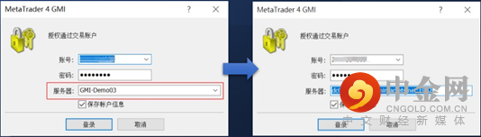 在【寻找交易商中】搜寻GMI服务器并登录您交易账户对应服务器地址,输入您的交易账户和密码点击登录即可。