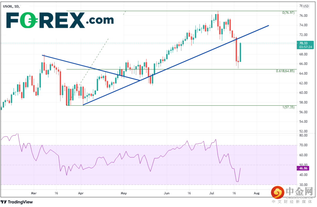 油价跌至3月24日低点到7月6日高点行情的61.8%回档位,即64.85附近。然而,即使EIA和API数据显示上周原油供应增加,油价今天还是展开反击且清除止损盘。上档阻力位在近期破败上升趋势线71.66附近,然后分别是7月13日和7月6日高点75.47和76.95。
