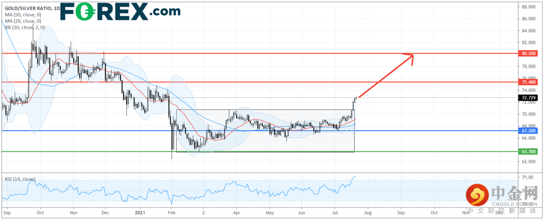 在日线图上,黄金白银比率呈现向上突破。它升破了4个多月的盘整区,并远离20日及50日移动均线。