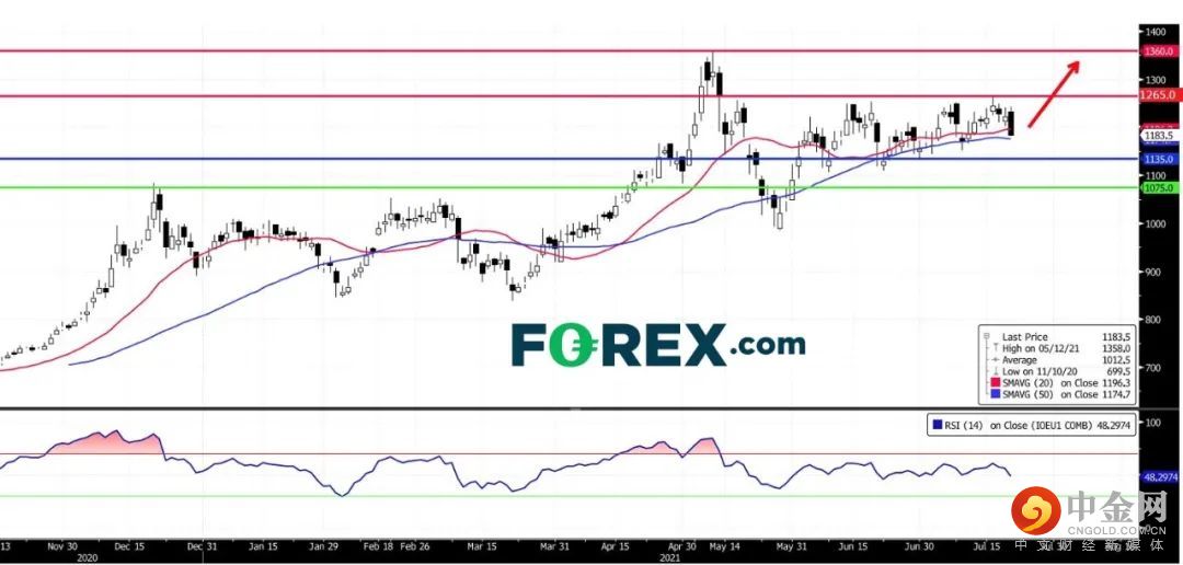 相反,若铁矿石期货价格失守1,135元人民币,将反转看跌,下一道支持位在1,075元人民币。