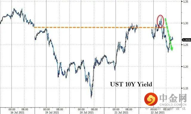 美国10年期基准国债收益率在欧股早盘转升后上行,盘中一度升破1.31%、逼近1.32%,刷新本周四日内盘中新高,日内升幅将近3个基点,此后持续回落,美股早盘回吐所有升幅转降,临近午盘时下测1.23%刷新日低,但和周二下逼1.12%所创的五个多月来低谷仍有距离。