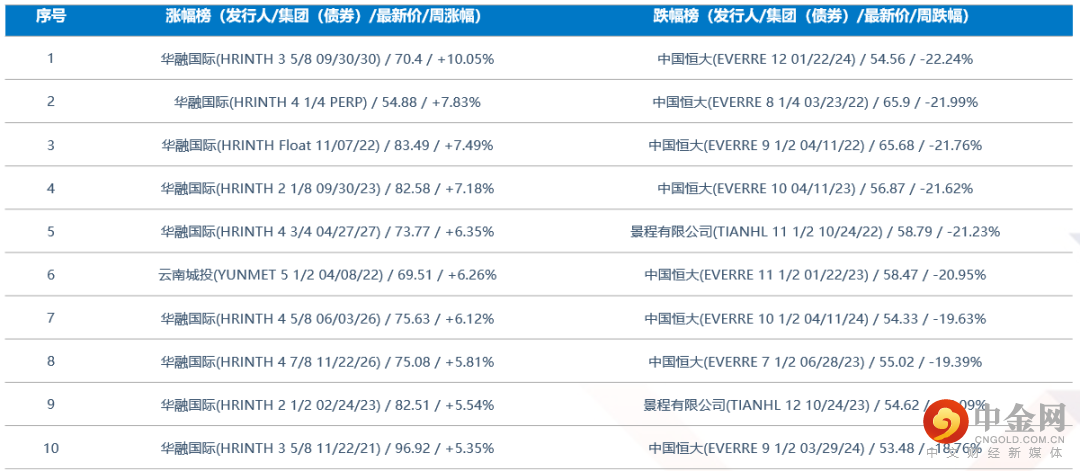 中资美元债二级市场每周涨跌榜
