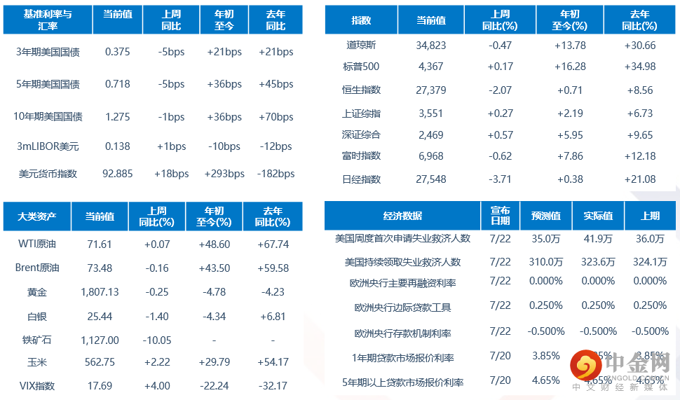 利率汇率:在本周初连续两个交易日自低位大幅反弹后,本周四(7月22日)美债收益率的升势戛然而止。当天公布的美国初请失业金数据表现不佳,帮助美债多重整旗鼓。另一方面欧央行继续维持宽松政策,推动欧债收益率在欧洲央行利率决议后全线下挫,美债收益率也因此承压。