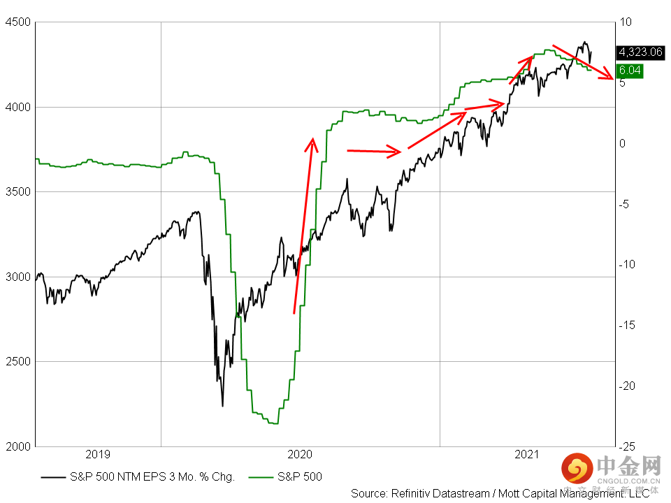 也许下面的图表能解释:标普500指数12个月远期市盈率预期在3个月时间里的走势变化。市场预期市盈率的增长率变化,并且自2020年3月的低点已经成功地上涨。