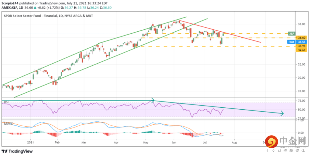 SPDR金融指数基金的反应强烈,不过今天该基金的状况并不比上周更优,其负向RSI向下,并且价格水平整体呈下降趋势。