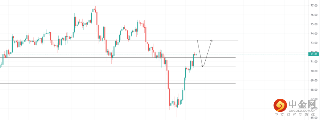 美元指数受承压,原油受提振,关注70.45的4小时支撑位置,回调收多可看多至73.30,止损70.06;关注73.30压力位,4小时受阻收空即可看空至70.45,止损73.71