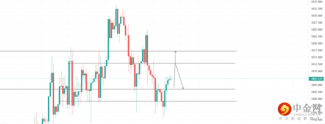 美元指数受承压,黄金反弹,关注1803.47的支撑位,4小时回调收多即可看多至压力位1817.17位置,止损1801.00;关注1812.84压力位,4小时受阻收空即可看空至1803.47,止损1814.30