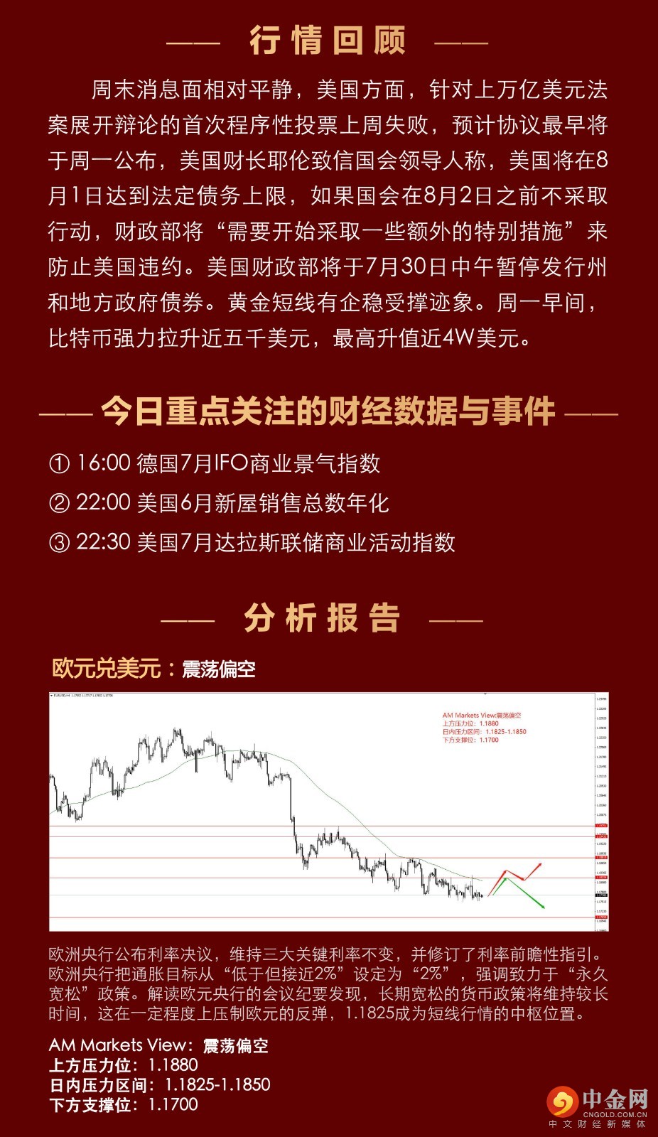 周末消息面相对平静,美国方面,针对上万亿美元法案展开辩论的首次程序性投票上周失败,预计协议最早将于周一公布,美国财长耶伦致信国会领导人称,美国将在8月1日达到法定债务上限,如果国会在8月2日之前不采取行动,财政部将“需要开始采取一些额外的特别措施”来防止美国违约。美国财政部将于7月30日中午暂停发行州和地方政府债券。黄金短线有企稳受撑迹象。周一早间,比特币强力拉升近五千美元,最高升值近4W美元。