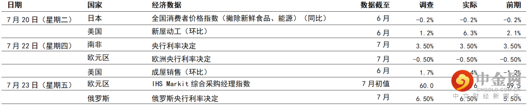 其他数据方面,新屋销售连续两次下跌后,预期6月份将升4.0%(环比)至800,000间。虽然消费者对房屋的需求有迹象稍为放缓,但新屋需求仍然相对稳健。待售成屋持续短缺,也有利新屋需求。由于需求依然强劲,预期5月份标普/Case-Shiller 20大城市综合楼价指数将升1.5%(环比,升同比14.9%)。