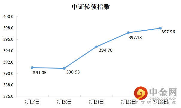 上周可转债市场表现亮眼,中证转债指数周五较周一上涨1.77%,收于397.96点,7月23日154支可转债上涨,占比约40%。