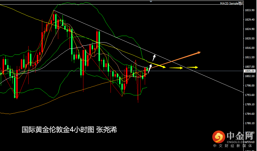 较长的观点看法,还是上周一直说到的4小时级别分析,100周期线已经明显走出上行趋势,相对冲击200周期线形成金叉看涨的概率较大,如有较大回落,得先反弹刷新1834美元高点,目前上方关注200周期线阻力以及1834美元而下的短期回撤压力。