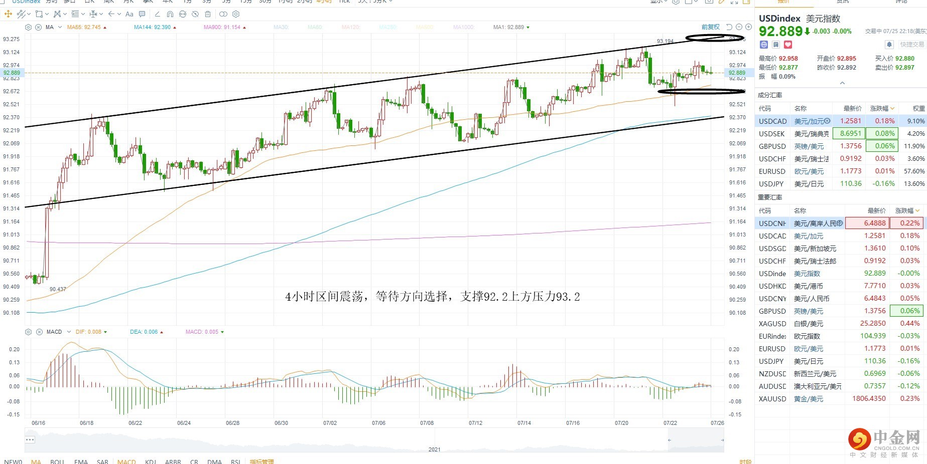 周一没有更多数据,一般情况下延续周五行情,而周五美元指数维持箱体震荡,短期给出方向的概率不大,而本周有欧美的GDP数据,同时有美联储利率决议,短期而言在数据登场之前维持震荡为主,等待基本面数据的方向指引,金价则维持区间震荡,若美联储决议继续偏鸽派,则不排除金价走强的可能性,油价短期反弹到位,但继续下行的空间也不大,所以在基本面没有变化之前,大概率维持区间震荡,目前很多品种都是等方向的节奏,切勿追涨杀跌,技术层面美元指数重要压力93.5下方支撑92.2等待方向指引