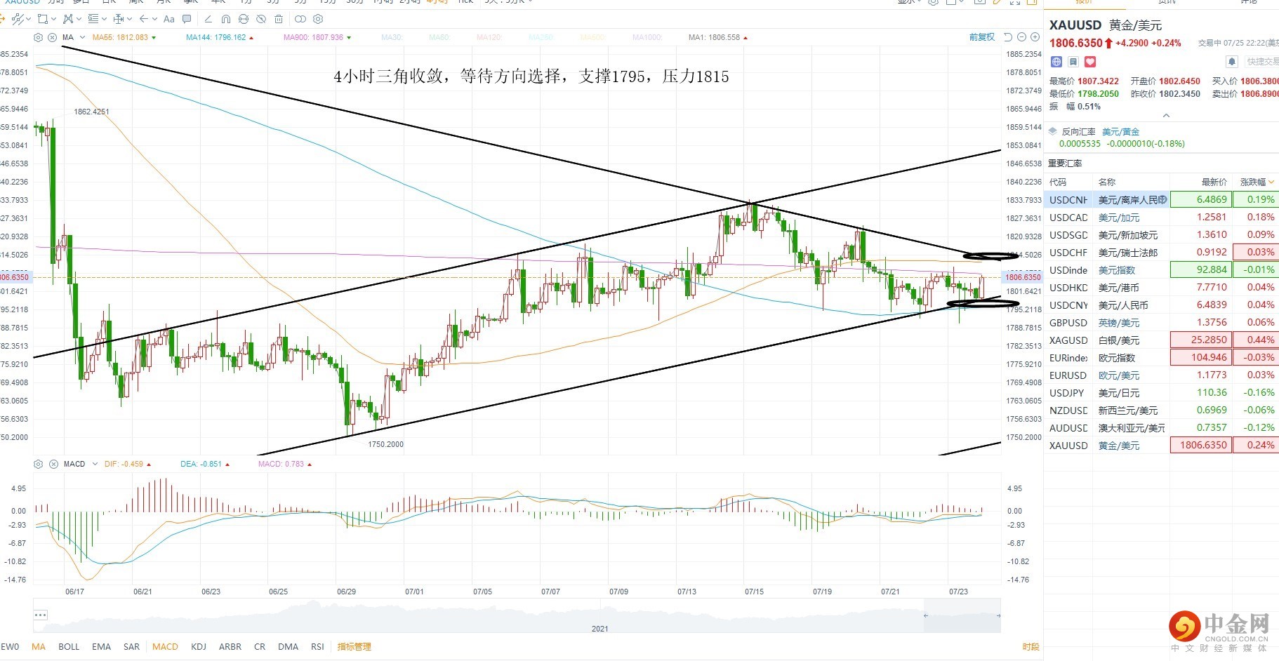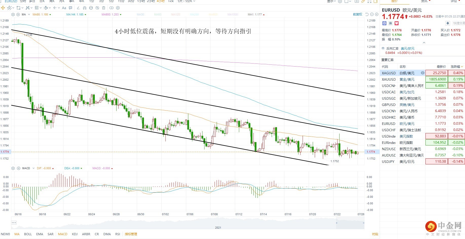 由于美元指数没有明确方向,所以欧美偏震荡为主,短期而言,没有明确方向,从技术层面上来看,4小时级别若无法站上1.1850则反弹概率不大,而下方需要关注前期低点1.1750是否跌破,若跌破则不排除加速下行的可能性,等待方向选择为主,基本面上关注本周的GDP数据,同时关注美联储利率决议是否会给出方向指引