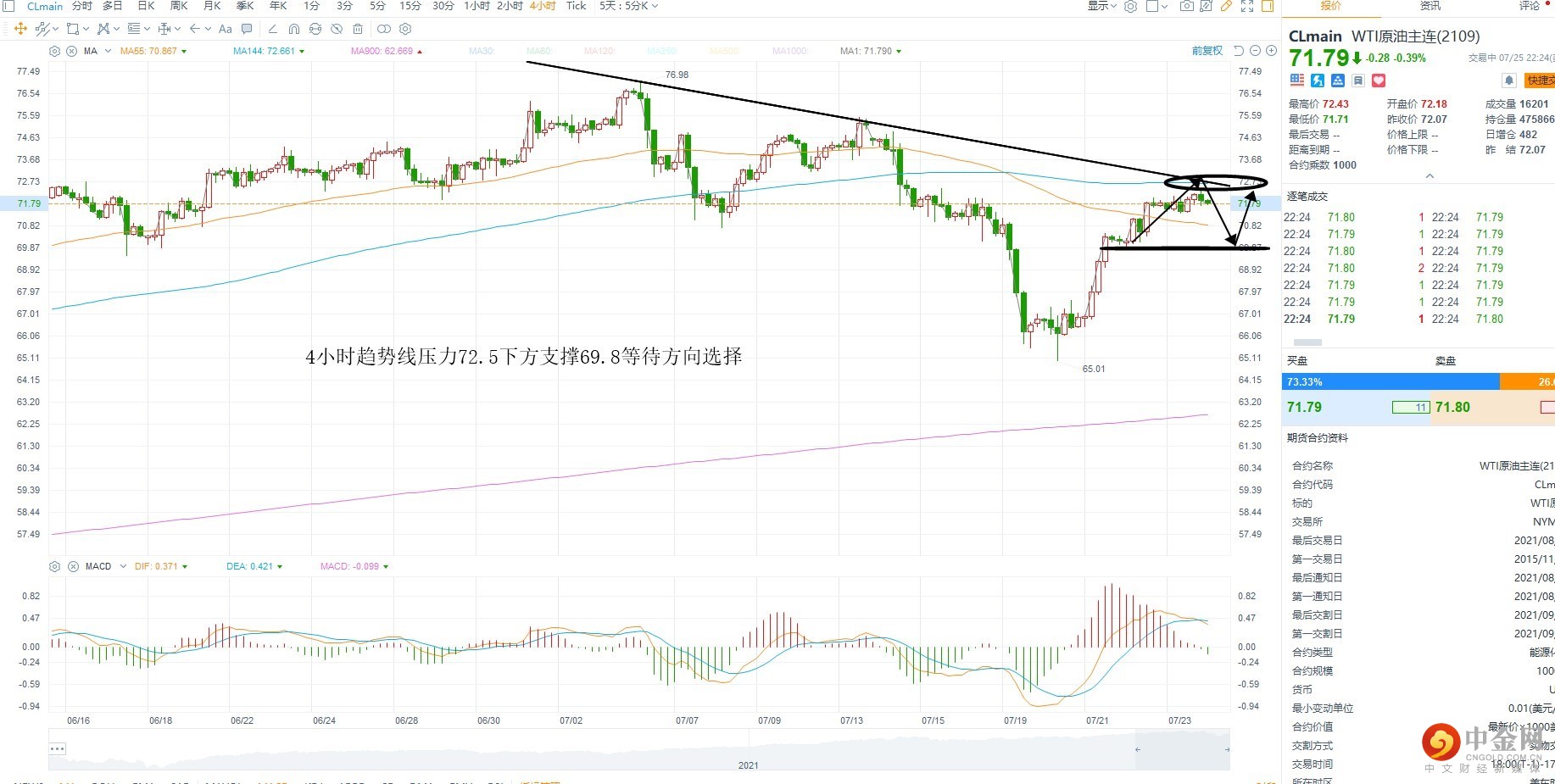 美原油大幅反弹之后停滞,短期突破的可能性不大,而供需层面上依然不支持油价新高,对于增产而言,继续打压供给端,关注本周EIA数据的变化,需求方面由于德尔塔病毒影响需求端上行,日内偏震荡为主,4小时级别下降趋势线压力72.5附近若无法突破则不排除回落的可能性,短期支撑69.8等待方向选择为主