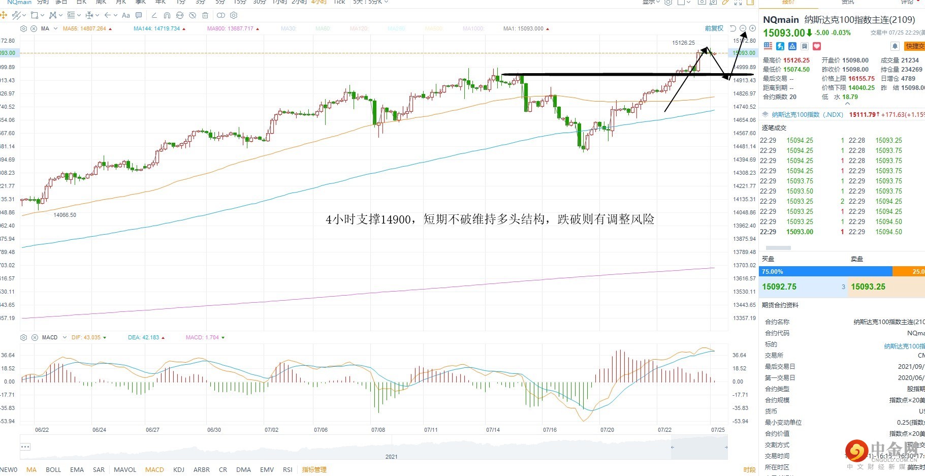 纳斯达克指数再创新高,短期存在加速的可能性,而基本面上需要注意的是本周的利率决议和GDP数据是否会影响风险偏好走弱,重点关注美债收益率的变化,技术层面上维持震荡上行,且不排除加速的可能性,日内回踩支撑14900不破维持多头结构不变,等待向上加速