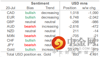 本周美元头寸的变动主要集中在四种货币上——欧元、加元、英镑和澳元,我们在本报告中跟踪的其他货币瑞士法郎、墨西哥比索、日元和新西兰元的变动幅度相当小。