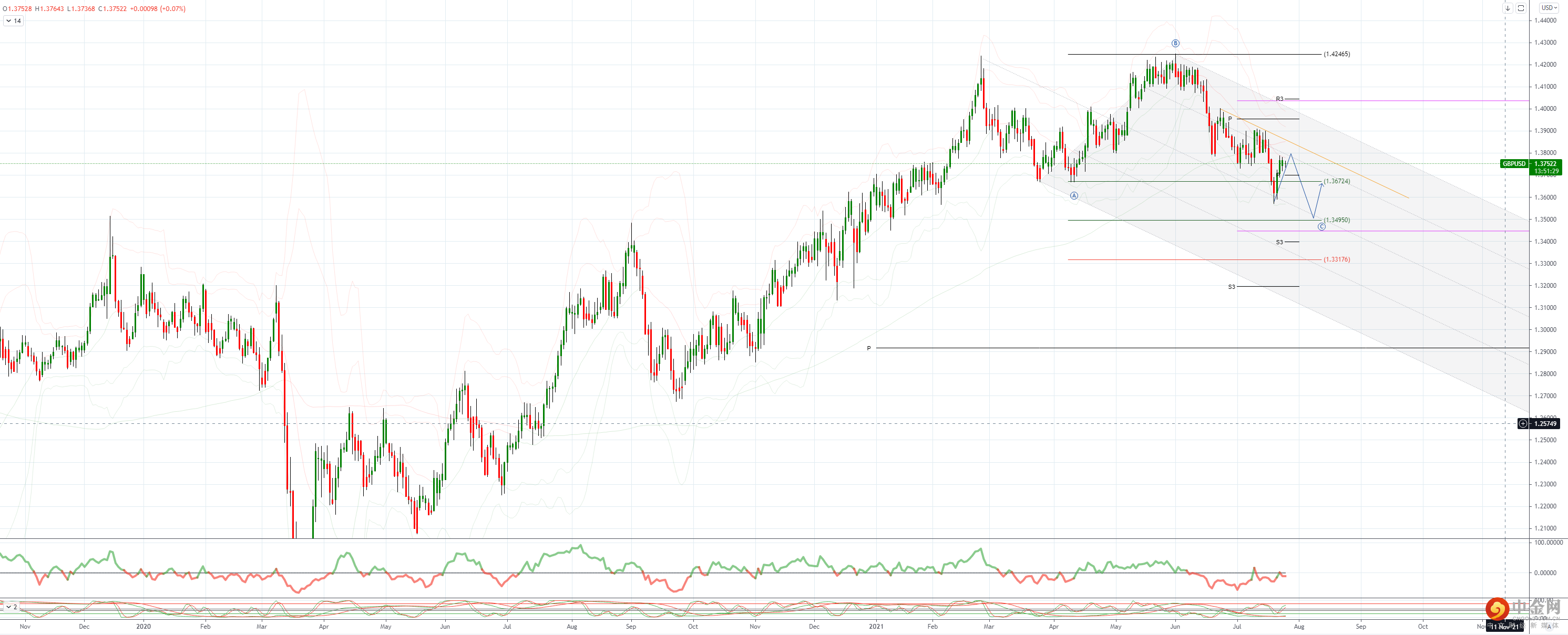 收于 1.3797 上方 21 日均线需要结束下行偏见