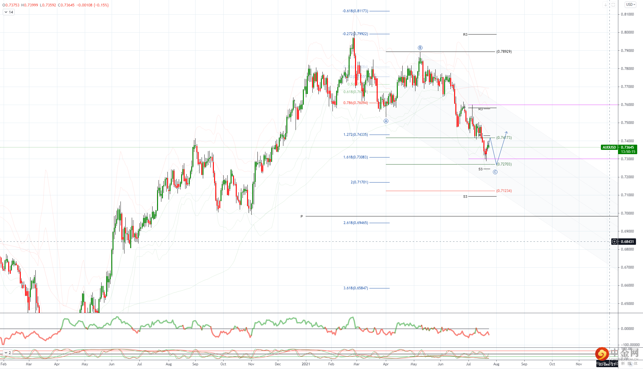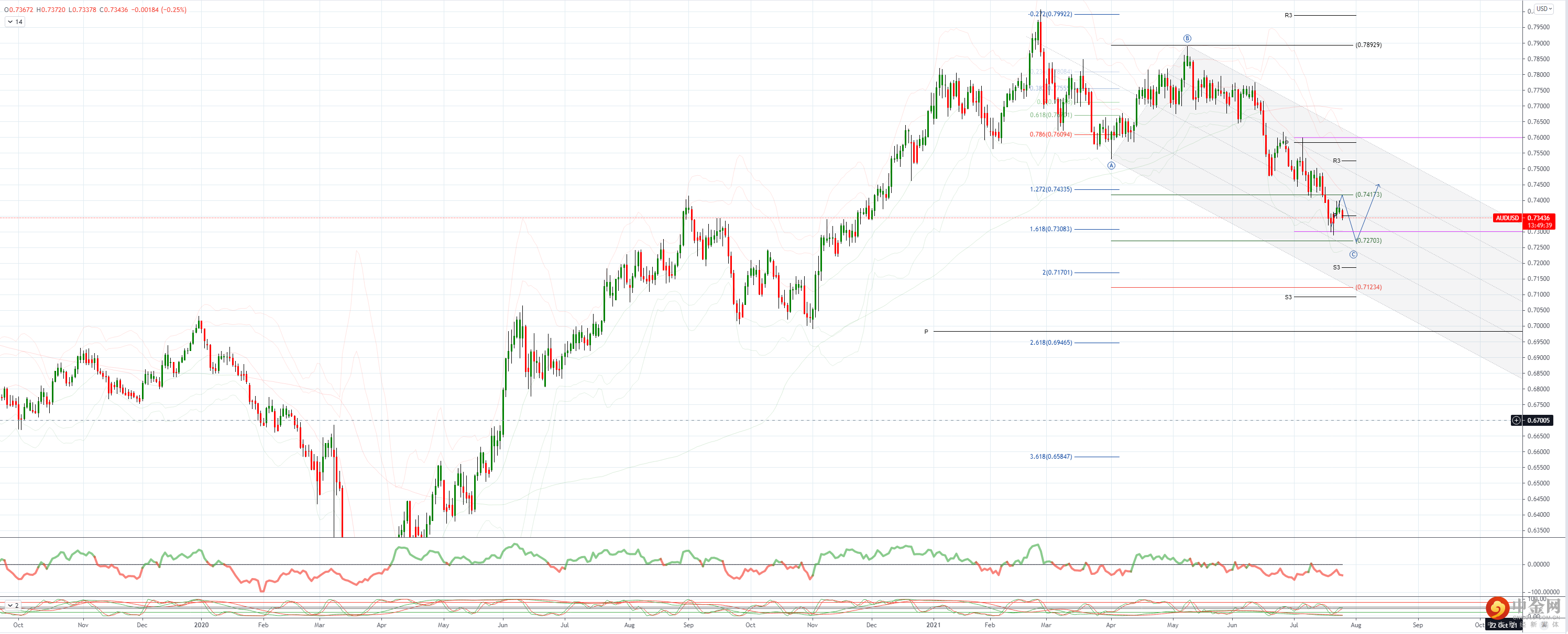 周四低点 0.7343 小幅支撑,上周低点 0.7287