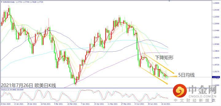 日级别线图,近期维持下降矩形空方跌势, 5日均线短线冲不过,大有可能下探新低。