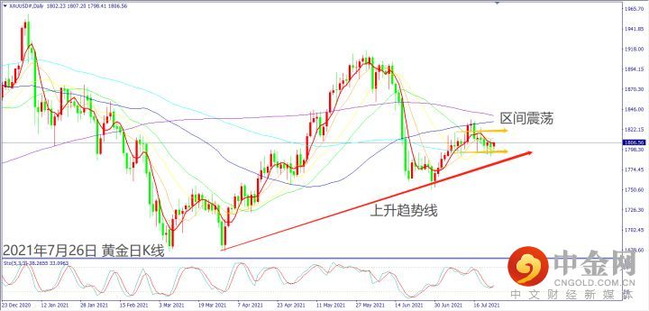 上周德尔塔病毒株造成全球疫情攀升,避险资金一度推升黄金冲高至1824美元。上周五美国国会官员对基建法案出台表示乐观,带动美国道琼斯和纳指连续上涨,造成避险资金抛售黄金,也让价格一度大跌35美元。上周五(23日)美国疾控中心宣布超级真菌传播致3死,再度让避险资金回补黄金守在1800关口上方整理。