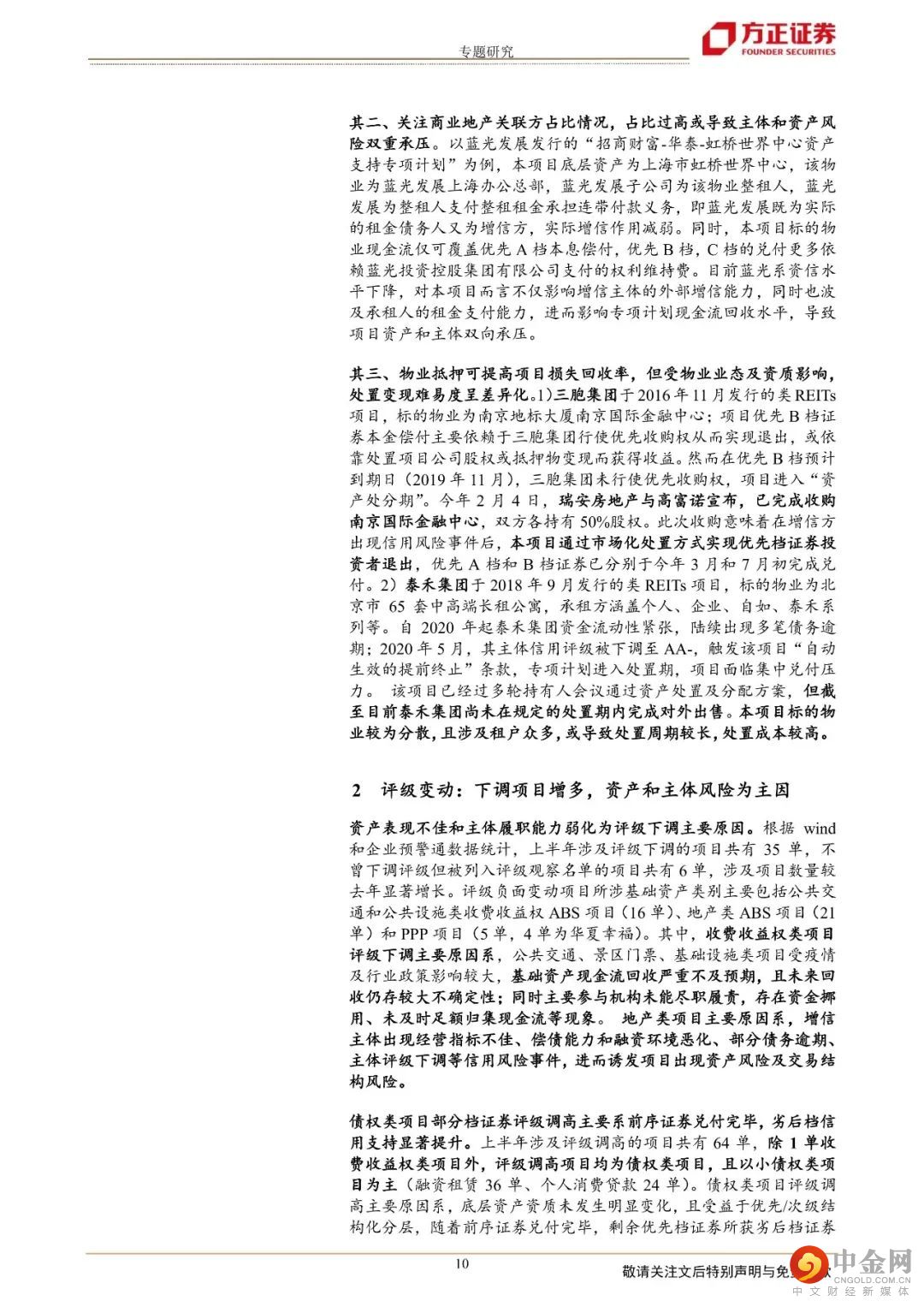 3)地产类ABS:供应链ABS方面,核心房企发生主体信用评级下调、债务逾期等风险事件,触发提前终止或加速清偿事件。CMBS/类REITs方面,上半年疫情对酒店行业的冲击尚存,物流仓储行业运营相对稳定;标的物业关联方占比较高的部分项目,主体风险已诱发资产风险;物业抵押可提高项目损失回收率,但受物业业态及资质影响,处置变现难易度呈差异化。