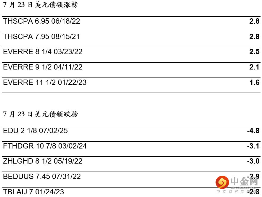 上周五(7月23日)高收益地产债普遍下跌,波动性高的债券如中梁、花样年和当代置业收跌2-4点,基本面较好的债券如融创和富力亦分别跌1点和1.5点。恒大则跑赢大盘,22年到期债券涨2-2.5点,长端收涨约1.5点,主要因为私人银行买入和对冲基金空头回补。非房地产板块表现优异,新发行的山东钢铁和中信银行皆受对冲基金和国际长线基金追捧,分别收涨约0.875点和1点。投资级债券价格主要持平。