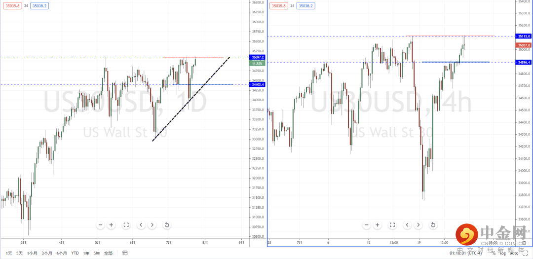 道琼斯指数:目前行情继续处于在高位区间承压,上方水平压制带在35097.2一带,并且有回落下行迹象。虽然整体趋势处于在多头阶段中,但从日内4小时,短期价格也继续向下测试关键位置34896.4一带。可关注价格在此支撑区域的表现,如果破位可适当关注短期空头机会,目标位置参考34778.0附近。