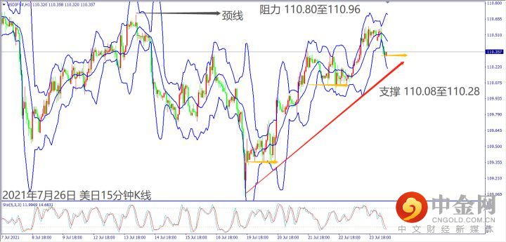 日级别线图,近三天守住5日均线和110.00关口,一旦突破颈线110.69,有望启动涨势;15分钟K线,短线形成盘涨走势,若是在110.30高档盘底,有机会挑战上方阻力。