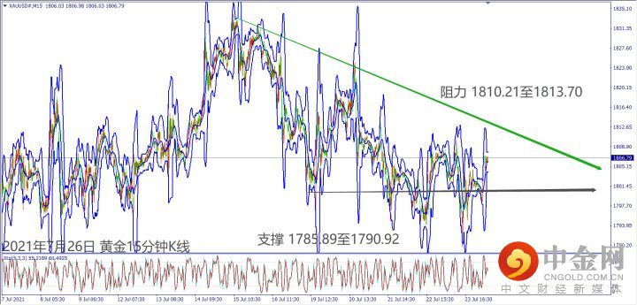 日级别线图,近期维持在1790~1820区间震荡,5日均线冲不过,可能回测盘整底部;15分钟K线,近期在1800附近震荡,一旦跌破1790关口,可能下探1780美元。