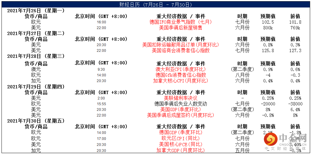 上周五,恒指收跌1.45%,教育股重挫,恒大概念股、软件开发概念股跌幅居前,新东方收跌逾40%。美股方面,受益于美国经济数据和二季度财报优于预期,美股市场连续四天高歌猛进,上周五三大股指齐创历史新高。因此,短线预计港股也有一定支撑。