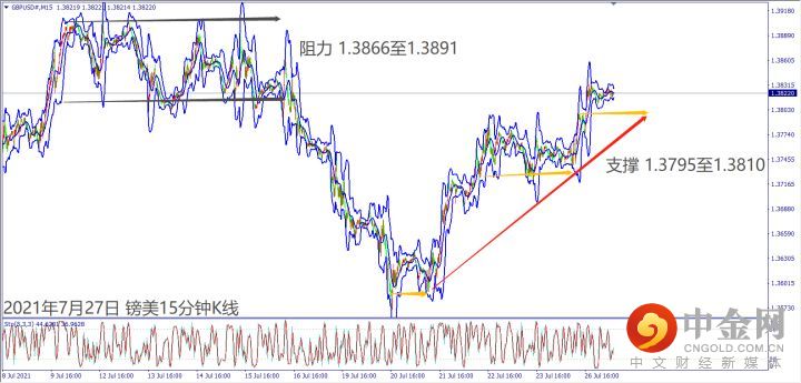 日级别线图,V转后站上5日均线3天,一旦突破30日均线,有望延续涨势;15分钟K线,短线出现盘涨,若守住1.3800关口盘整,大有可能挑战前高阻力。