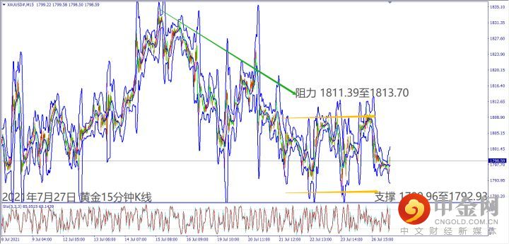 日级别线图,短线在1800美元附近盘整,一旦突破5日均线,有机会启动涨势;15分钟K线,近期维持区间震荡,若突破盘整顶部,可能挑战上方阻力。