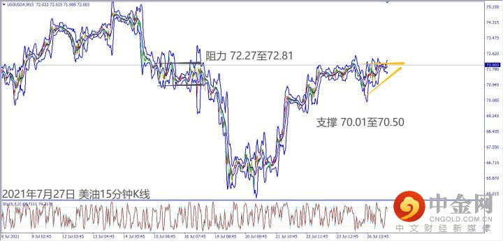 日级别线图,长脚十字线守住5日均线,下降趋势线冲不过,可能回测70美元;15分钟K线,短线出现上升三角形,72关口若冲高又回落,可能下探起涨支撑。