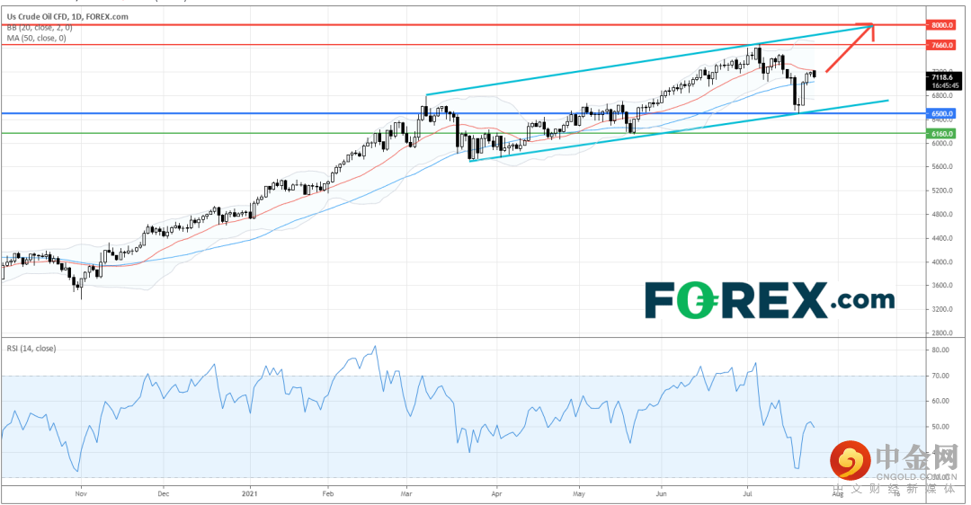 只要之前的低位6,500点仍被视作主要支持(止损)位,料美国原油CFD将再试5月高位7,660点和下一道阻力位8,000点的大关。