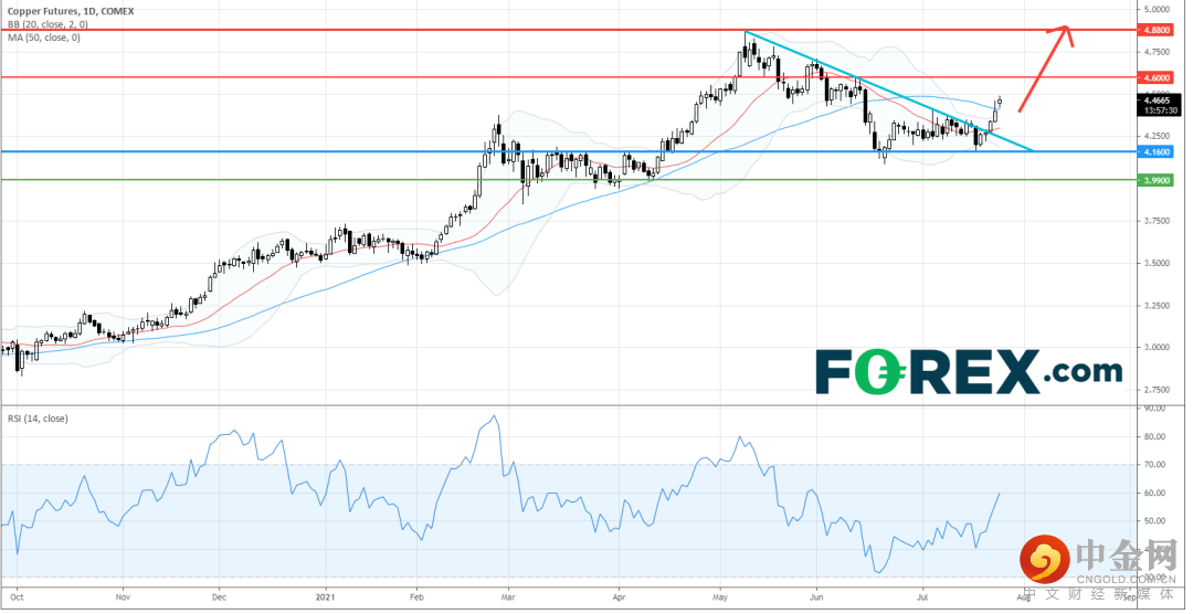 在日线图上,芝商所铜期货 (连续合约) 由6月低位反弹并升穿了一条由5月高位拉出的下降趋势线。目前,20日均线已经转为上升,相对强弱指数亦升穿50的中性水平。